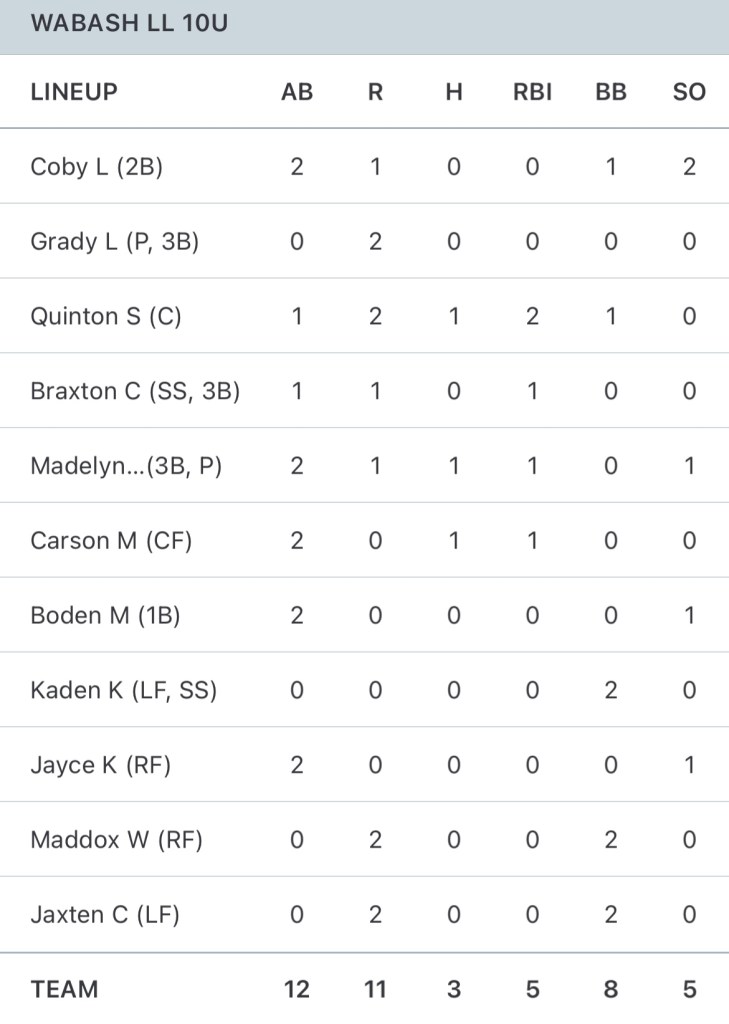 The Wabash 10U All Star team defeated Foster Park 11-1 Wednesday