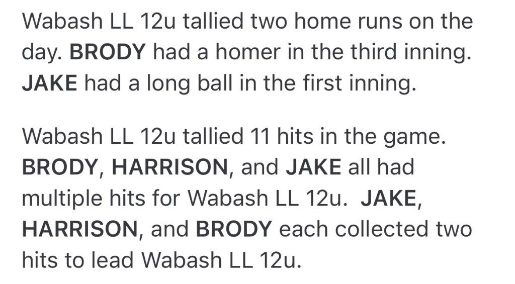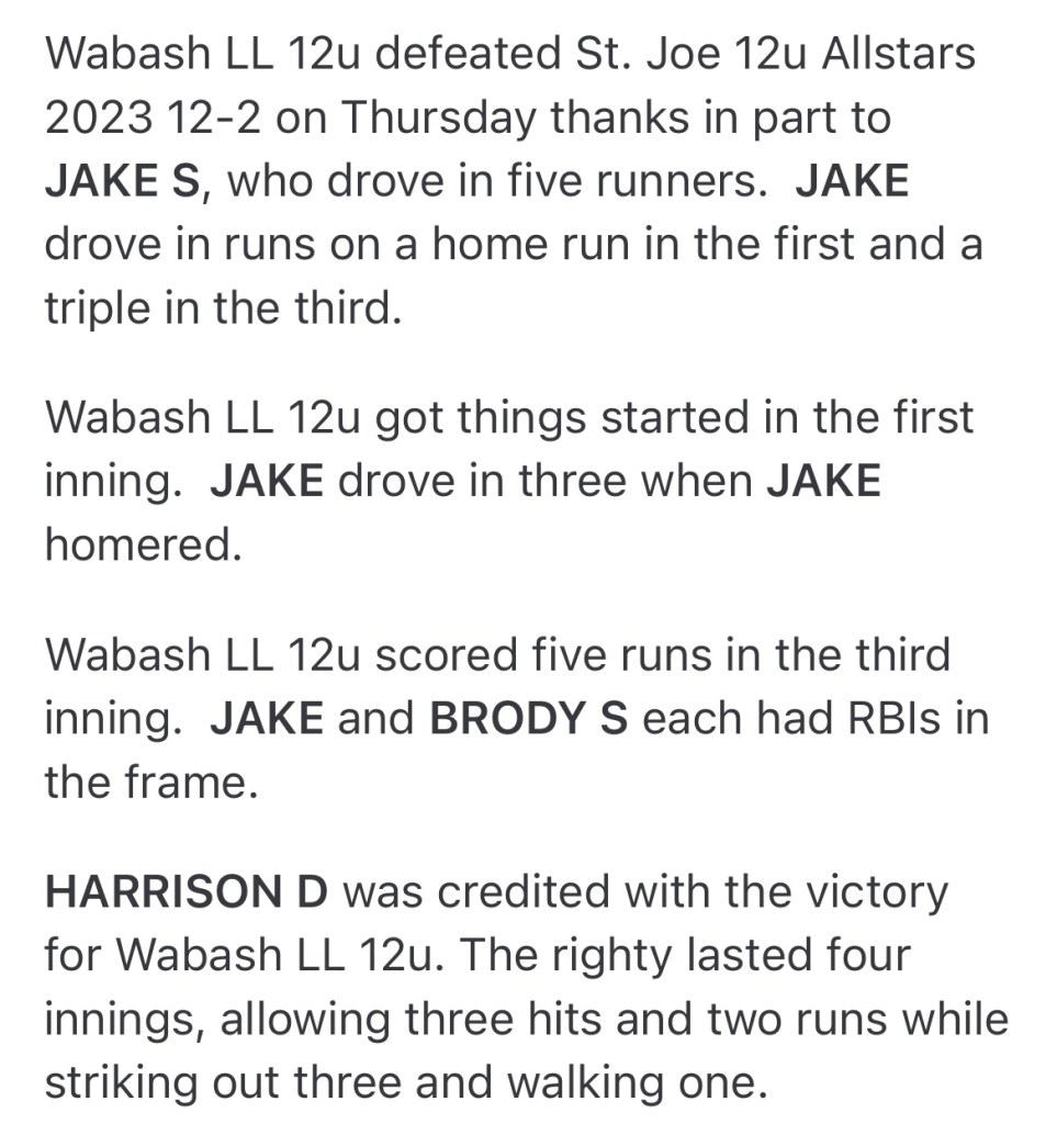 The Wabash 12 year old’s hit two home runs to lead the All Stars to a 12-2 win over St Joe Thursday.