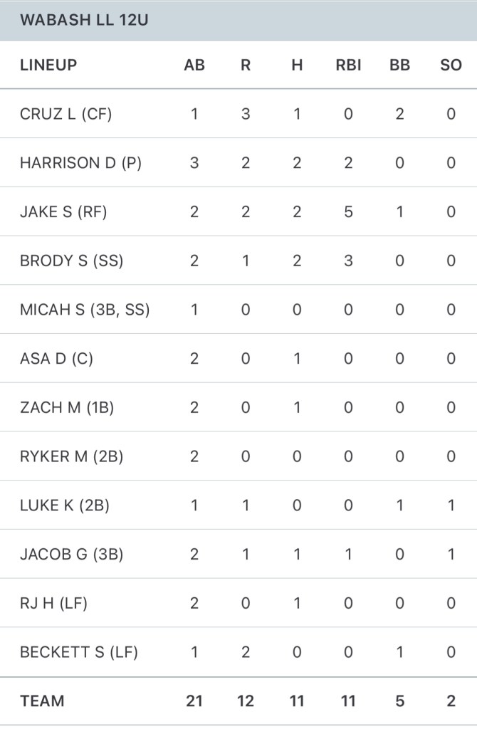 The Wabash 12 year old’s hit two home runs to lead the All Stars to a 12-2 win over St Joe Thursday.
