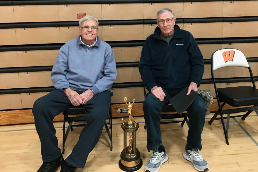 Jerry Hipsher and Joe Deeter started on the 1956 team and paid the 2024 champions a visit Monday before practice. The current champions were able to get a photo with the past champions with both trophies.