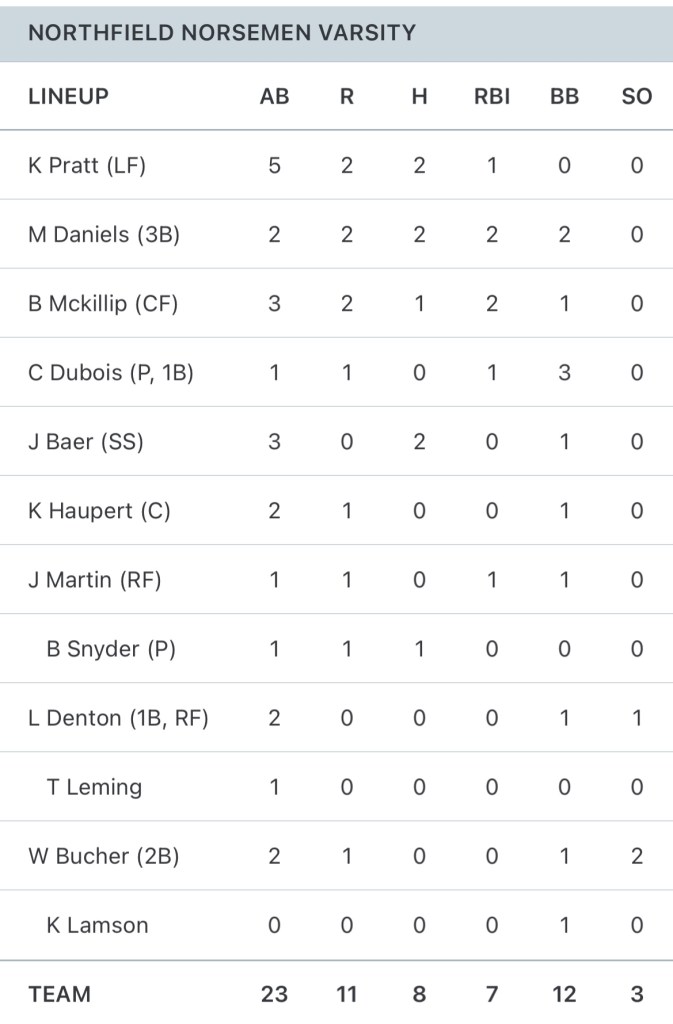 Leading the Norse on the mound was freshman Caleb Dubois who threw 5.0IP with 3H, 4BB, 8K, and 3ER. Closing the game out for the Norse was Ben Snyder who threw 2.0IP with 1H, 1BB, 3K, and 1ER. Leading the offense was Maddux Daniels, Jaden Baer, and Kam Pratt with 2 hits each. Ben Snyder and Brandon Mckillip added a hit each.