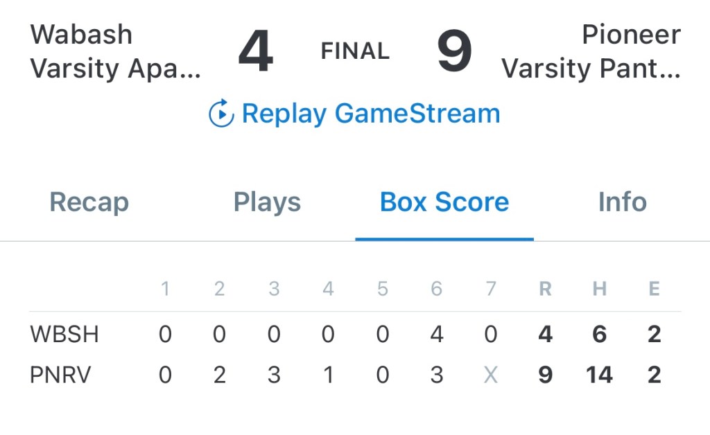 The Wabash Lady Apaches softball team fell to Pioneer 9-4 in the Rochester sectional Tuesday.