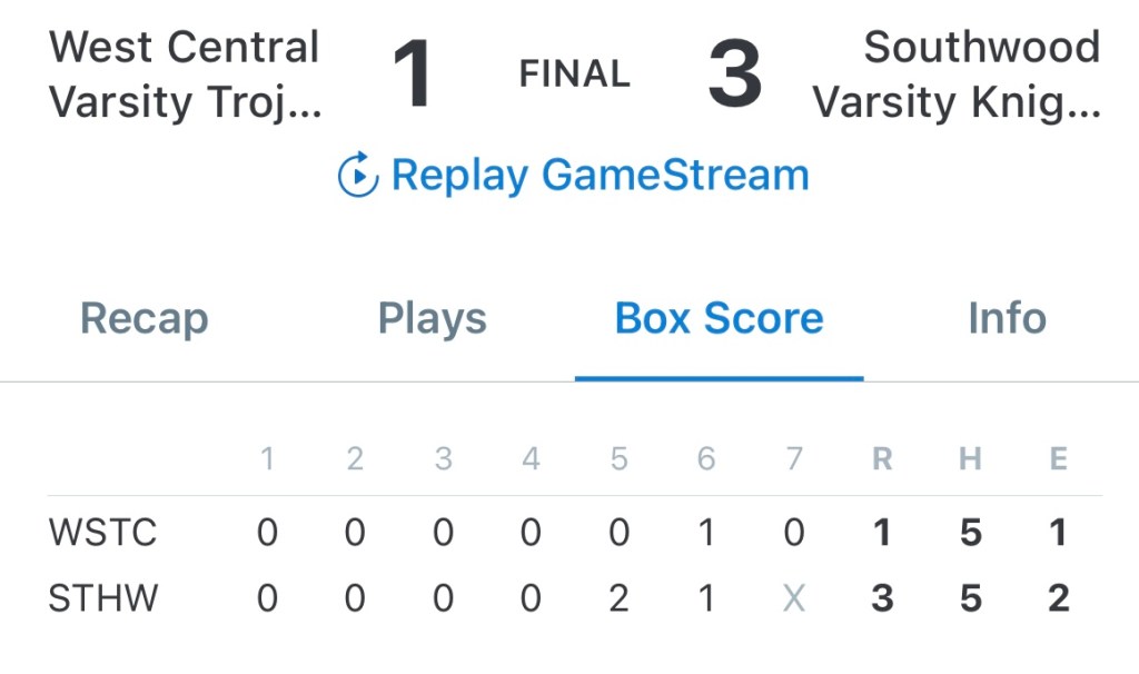 West Central would get a run back in the sixth on a solo homerun before the Knights answered in the bottom of the inning. Izzy Ashba led off with a single before stealing second. With two outs Hali Pershing doubled to left center, scoring Ashba for a 3-1 lead.